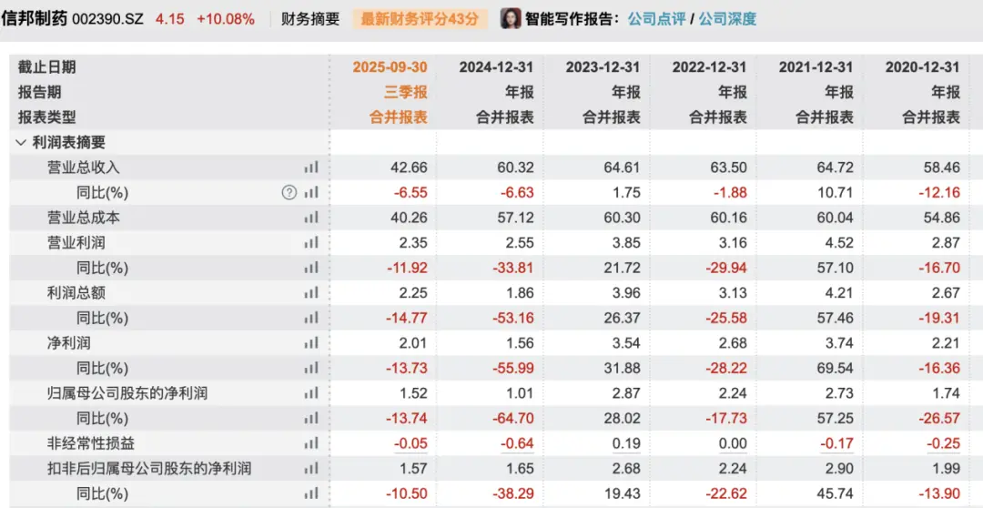 业绩方面,信邦制药今年前三季度实现营收42.66亿元,同比减少6.55%;归母净利润为1.52亿元,同比下滑13.74%。拉长时间来看,信邦制药业绩表现不稳定,2024年归母净利润跌超60%。