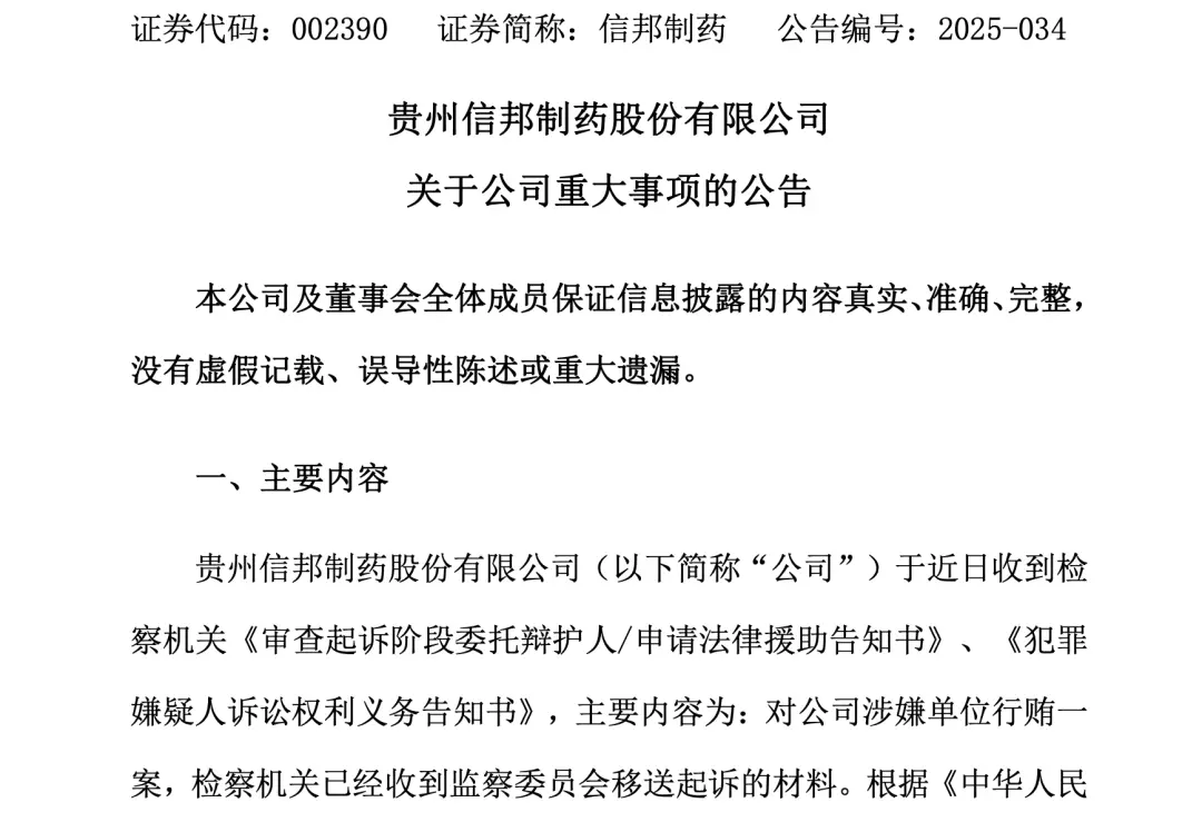 12月10日晚间,信邦制药发布公告称,公司近日收到《审查起诉阶段委托辩护人/申请法律援助告知书》和《犯罪嫌疑人诉讼权利义务告知书》,对公司涉嫌单位行贿一案,检察机关已收到监察委员会移送起诉的材料。