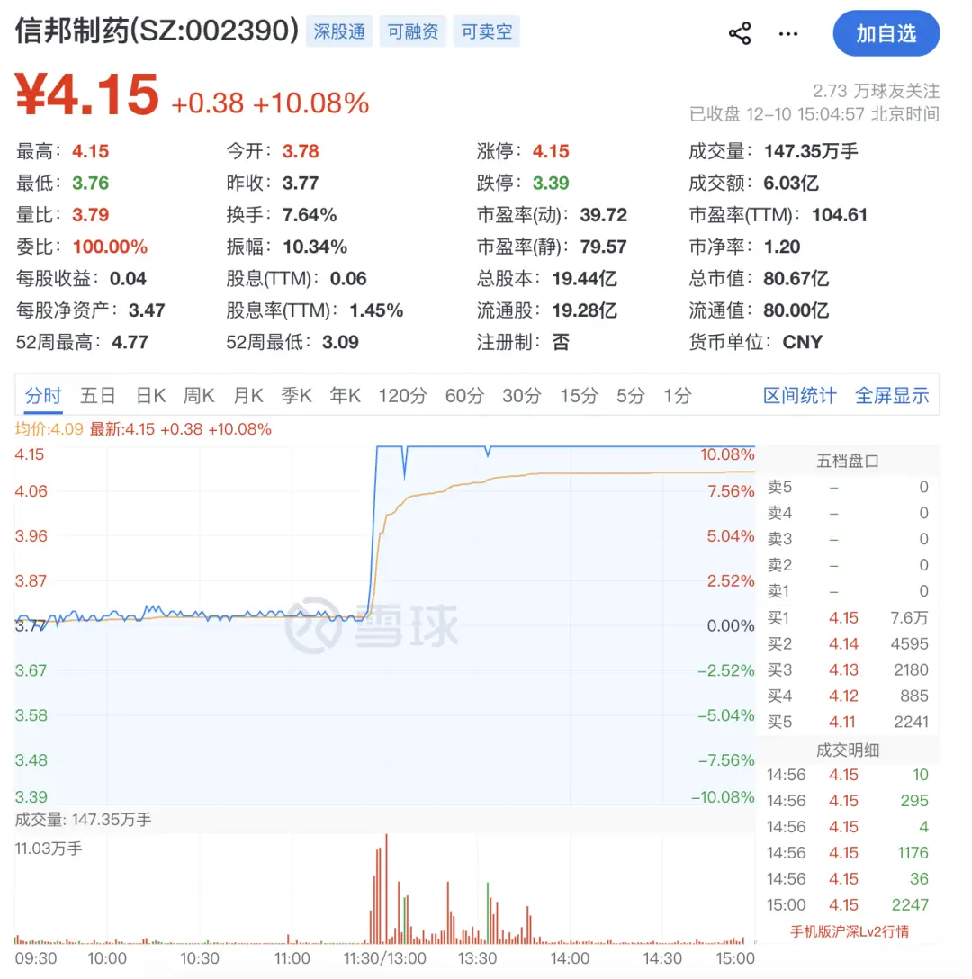12月10日,信邦制药股价午盘异动,股价直线拉升涨停。截至收盘,该股报4.15元/股,总市值为80.67亿元。