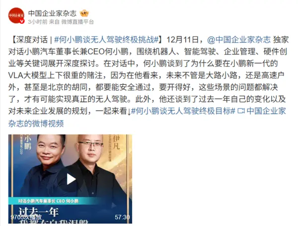 小鹏汽车官方:感谢《中国企业家》的深度记录,何小鹏在专访中分享了他的思考:“峰顶也是最大的逆境。” “好的体系要能控上限、提下限。” “想用科技改变世界,必须软硬同做。” ——这是关于技术、组织与长期主义的深度对话。