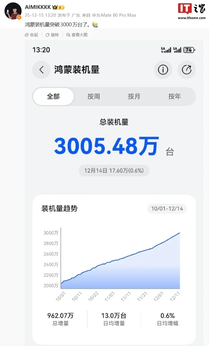 IT之家 12 月 15 日消息,博主 @AIMIKKKK 今日发文透露,华为鸿蒙装机量突破 3000 万台(相关页面显示总装机量来到了 3005.48 万台)。