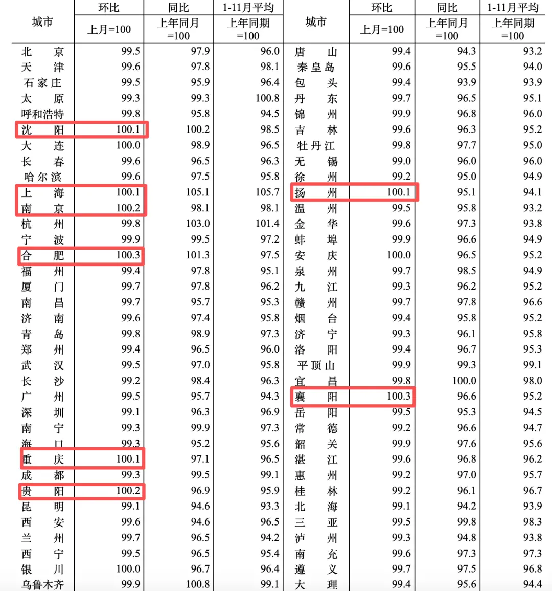 12月15日,国家统计局公布了11月70个大中城市商品住宅销售价格变动情况。数据显示,11月70个大中城市中,新房价格环比上涨的城市增至8个。