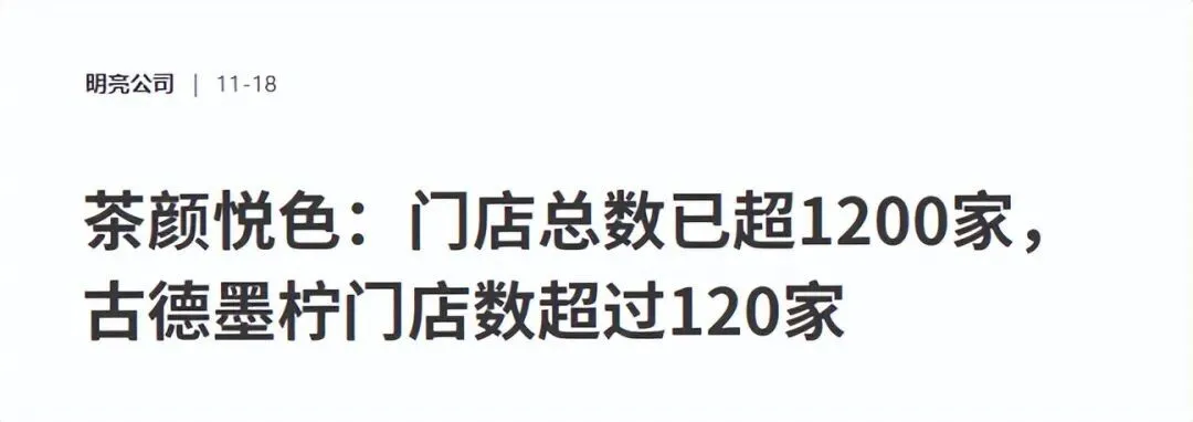 在蜜雪冰城破5万、古茗破万店、茶百道和沪上阿姨也即将踏入万店的新茶饮市场上,目前茶颜悦色品牌的门店总数仅在1200家左右。