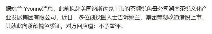 近期有消息称其母公司湖南茶悦文化正筹划改道港股上市,此前还传出拟赴纳斯达克上市的消息,但官方均未予置评。
