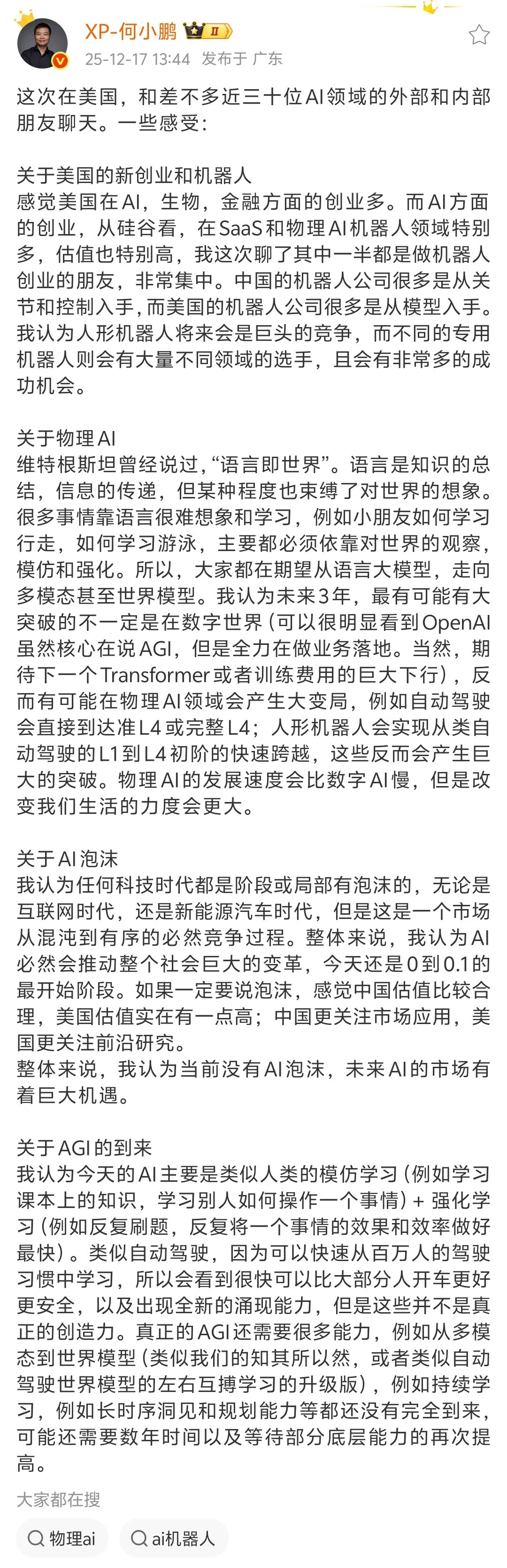 何小鹏:当前没有AI泡沫 未来AI的市场有着巨大机遇