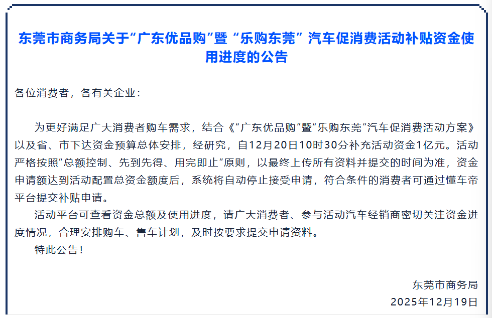 各位东莞车友注意啦!想买车的小伙伴千万别错过这个重磅福利——东莞市商务局近日发布通知称,为更好满足广大消费者购车需求,结合《“广东优品购”暨“乐购东莞”汽车促消费活动方案》以及省、市下达资金预算总体安排,经研究,自12月20日10时30分补充活动资金1亿元,消费者最高享5000元购车补贴。名额有限、先到先得。