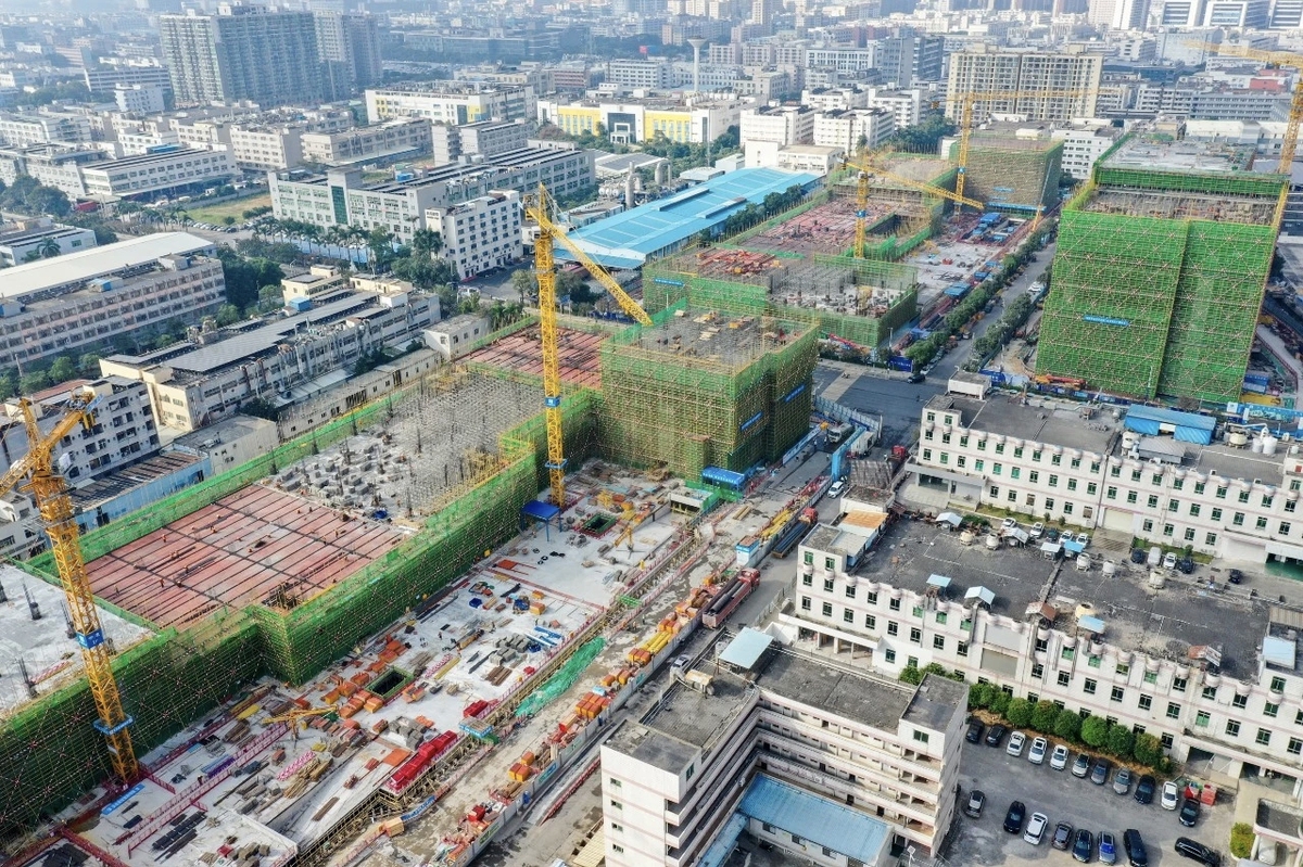塔吊高效运转、模板安拆、混凝土浇筑……在长安镇盛安产业中心项目施工现场,800余名施工人员各司其职、协同作业,呈现一派火热的攻坚景象。