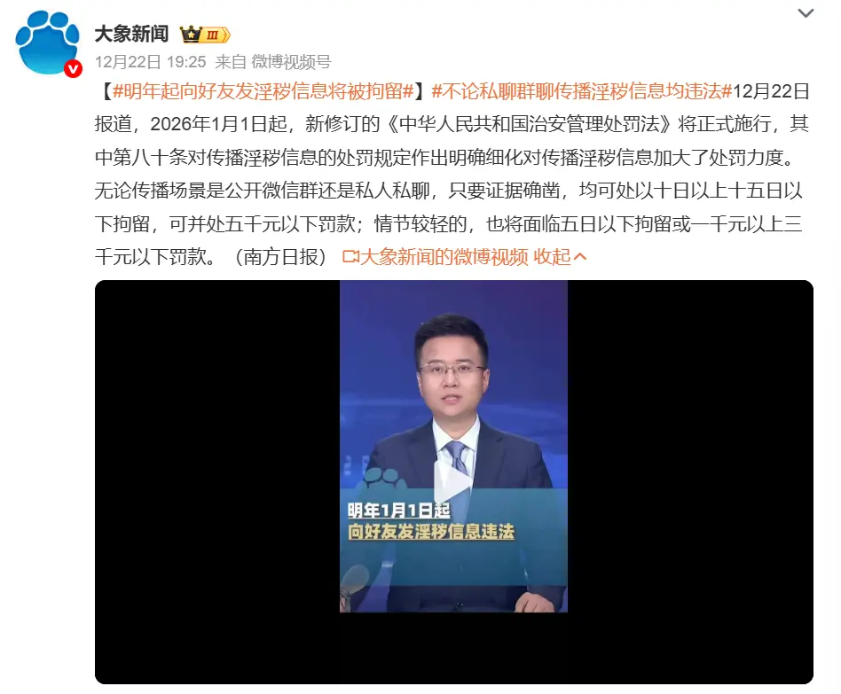 即使是私人聊天中发送不雅照片或视频,一旦被举报查实,从2026年1月1日起也会受到法律制裁。
