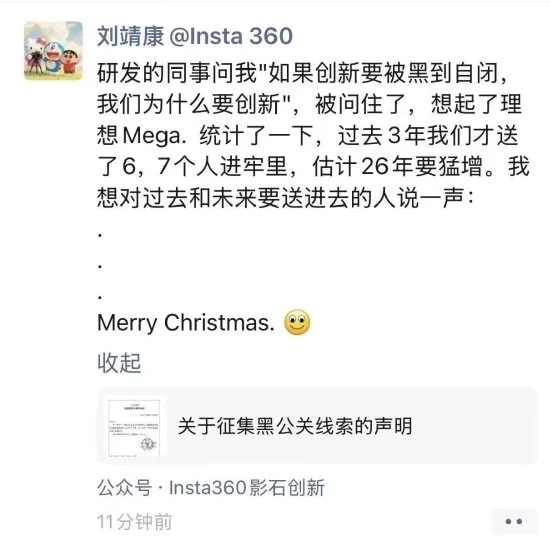 凤凰网科技讯 12月25日,影石创新创始人兼CEO刘靖康发文称,研发的同事问我“如果创新要被黑到自闭,我们为什么要创新”,被问住了,想起了理想Mega。统计了一下,过去3年我们才送了6、7个人进牢里,估计26年要猛增。