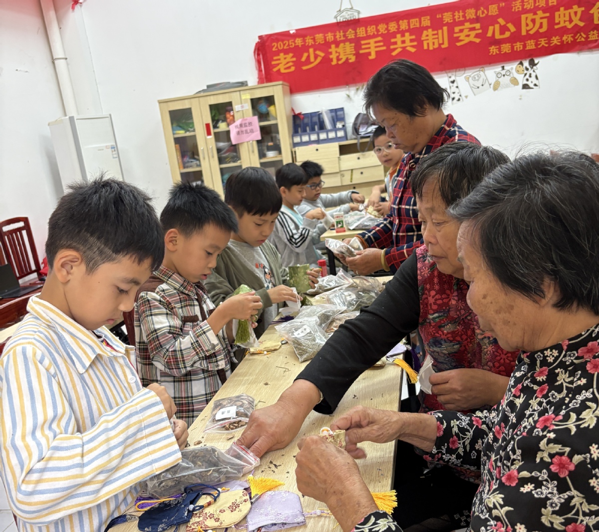 “张奶奶,您家阳台的积水盆要及时倒掉,这样能减少蚊子孳生!”“小同学,这个防蚊香囊的草药要装得匀称些,驱蚊效果才更好”……近日,一场防蚊灭蚊行动分别在洪梅梅沙村、黎洲角村和夏汇村社区综合服务中心里热闹开展:一老一小携手一边学习蚊虫孳生防治知识,一边结对走进困境老人家中,清理卫生死角、赠送自制防蚊礼包、关爱老人身体健康,不仅让社区防蚊灭蚊工作落到实处,更搭起了代际沟通的暖心桥梁。这个“代际同心圆”老幼共融成长计划项目活动由东莞市蓝天关怀公益服务中心执行,第四届东莞市社会组织“莞社微心愿”公益项目支持,项目资助方是东莞市嘉荣慈善基金会。