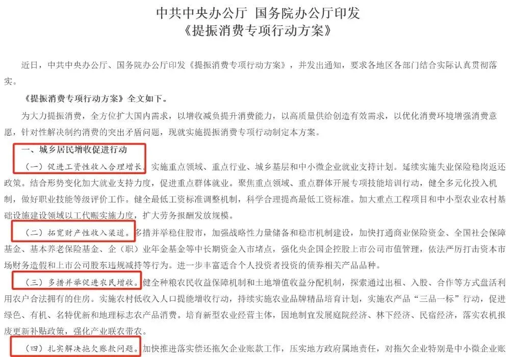 今年3月16日,中办、国办印发的《提振消费专项行动方案》中,明确提到“拓宽财产性收入渠道”作为城乡居民增收促进行动的重要任务之一。