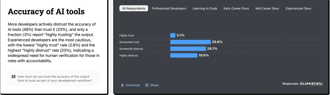 然而,不到3%的受访者表示他们高度信任AI生成的代码足够准确。