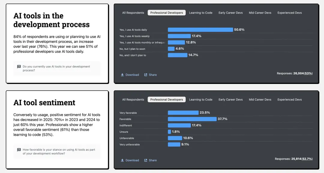 2025年Stack Overflow对专业开发者进行的调查发现,只有19.3%的受访者不使用AI,而持负面看法的开发者也占19.7%。