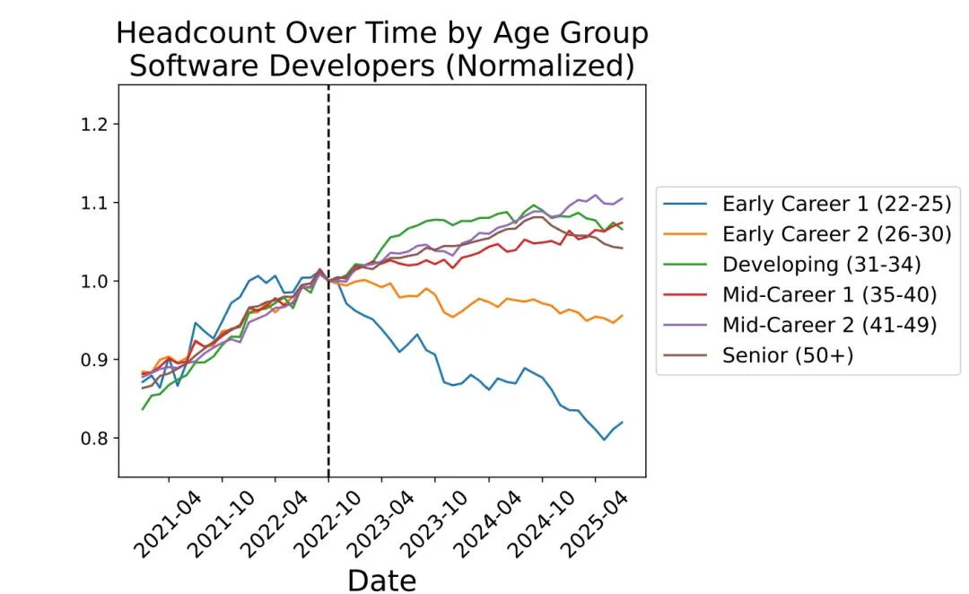 数据显示,年轻和年长开发者的就业情况直到2022年底是一致的。但从那时起,两者开始分化——年轻开发者开始失业,而年长开发者则没有。