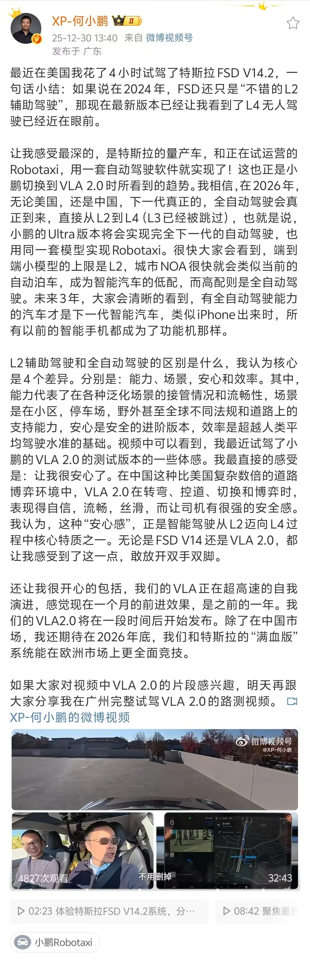凤凰网科技讯12月30日,何小鹏在个人微博发布在美国体验特斯拉FSD的视频。何小鹏表示,去年FSD还只是“不错的L2辅助驾驶”,而最新版本已经让他看到L4无人驾驶近在眼前。何小鹏邀请马斯克在2026年底,和特斯拉的“满血版”系统在欧洲市场上全面竞技。何小鹏还预言,明年无论美国还是中国,全自动驾驶会真正到来,直接从L2到L4。