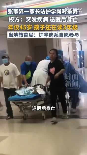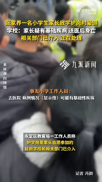 12月29日下午,在张家界永定区一所小学门口,一位家长在站护学岗时突然晕倒,送医后身亡。30日,事发小学工作人员告诉九派新闻记者,出事的家长今年45岁,据监控视频显示,该家长在护学岗大概站了20多分钟,期间还与其他家长聊天、抽烟,倒地后,学校第一时间将其送医,经检查显示其有基础疾病。