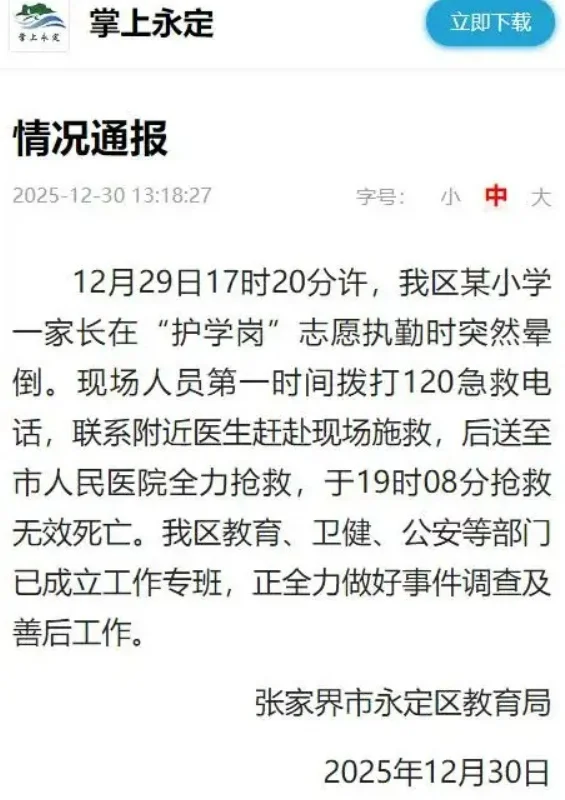 12月29日17时20分许,我区某小学一家长在“护学岗”志愿执勤时突然晕倒。现场人员第一时间拨打120急救电话,联系附近医生赶赴现场施救,后送至市人民医院全力抢救,于19时08分抢救无效死亡。我区教育、卫健、公安等部门已成立工作专班,正全力做好事件调查及善后工作。
