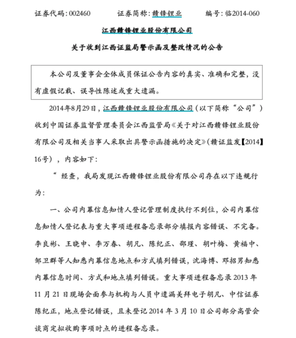 2020年5月,证监会网站发布对赣锋锂业出具警示函的决定。决定显示,赣锋锂业未对重大投资进行内幕信息知情人登记,如未对收购阿根廷Minera Exar公司 37.5%股权事项进行内幕信息知情人登记;内幕信息知情人登记不完整,2018年定期报告内幕信息知情人登记中相关人员签名缺失。