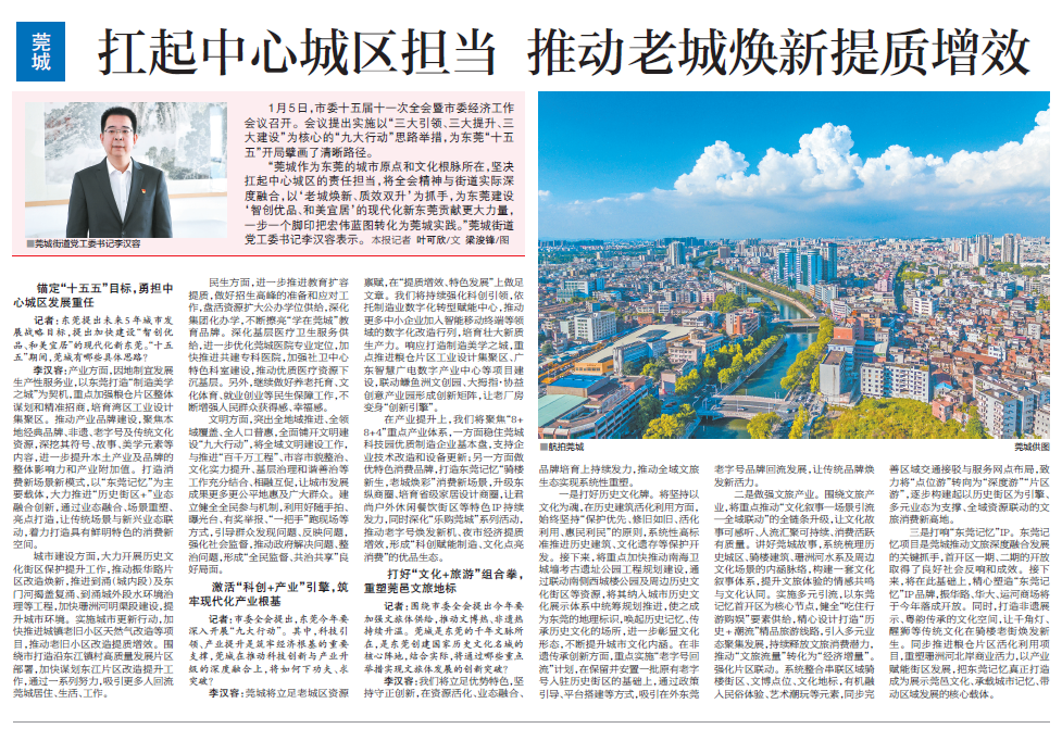 李汉容:莞城将立足老城区资源禀赋,在“提质增效、特色发展”上做足文章。我们将持续强化科创引领,依托制造业数字化转型赋能中心,推动更多中小企业加入智能移动终端等领域的数字化改造行列,培育壮大新质生产力。响应打造制造美学之城,重点推进粮仓片区工业设计集聚区、广东智慧广电数字产业中心等项目建设,联动鳒鱼洲文创园、大拇指·协益创意产业园形成创新矩阵,让老厂房变身“创新引擎”。
