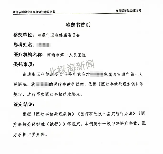 2025年12月9日,江苏省医学会对该病例再次鉴定,同样得出了“一级甲等医疗事故、医方负主要责任”的结论。