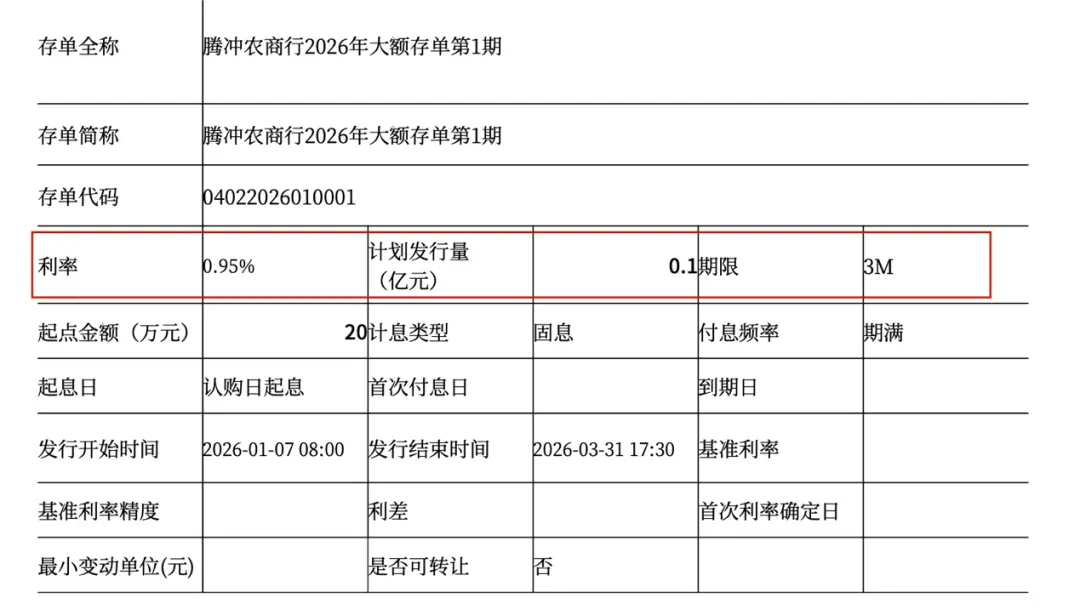 云南腾冲农商银行计划自1月7日起发行0.1亿元的2026年大额存单第1期,期限为3个月,起存金额为20万元,利率仅0.95%。“隆阳农商行2026年第一期个人大额存单3M”计划发行0.3亿元,起购金额为20万元,利率同样降至0.95%。