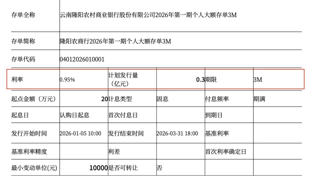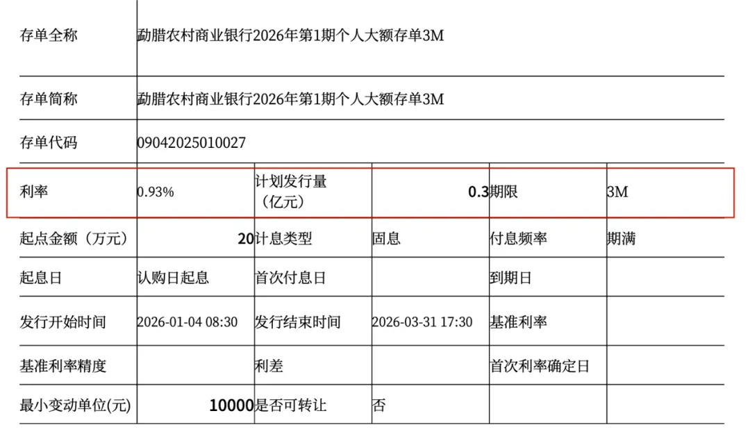 例如,“勐腊农村商业银行2026年第1期个人大额存单3M”自1月4日起发行,计划发行0.3亿元,起存金额为20万元,利率已降至0.93%。