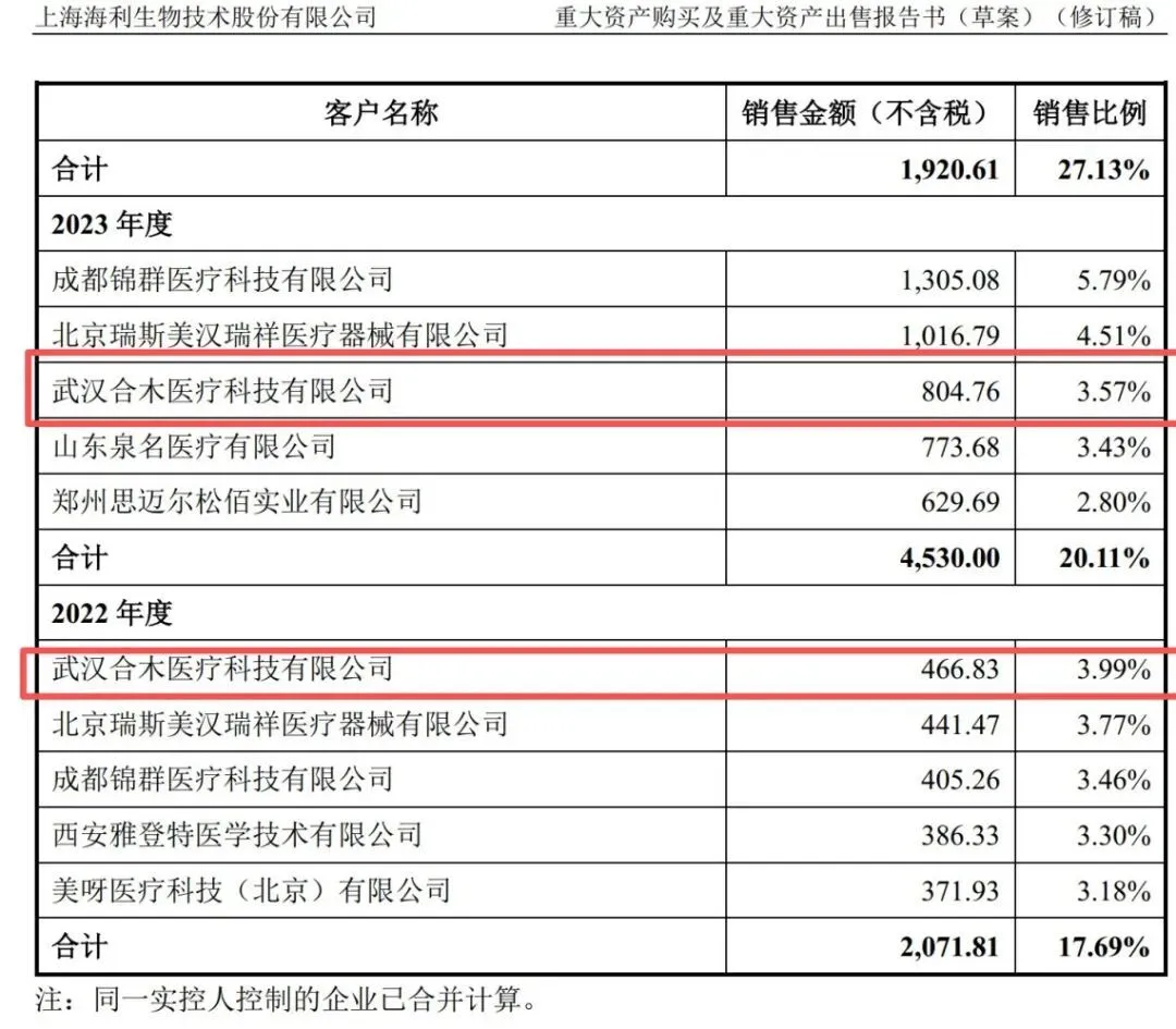 武汉合木医疗科技有限公司(以下简称武汉合木)位列瑞盛生物2022年第一大客户和2023年第三大客户,瑞盛生物向其销售金额分别约467万元和约805万元。