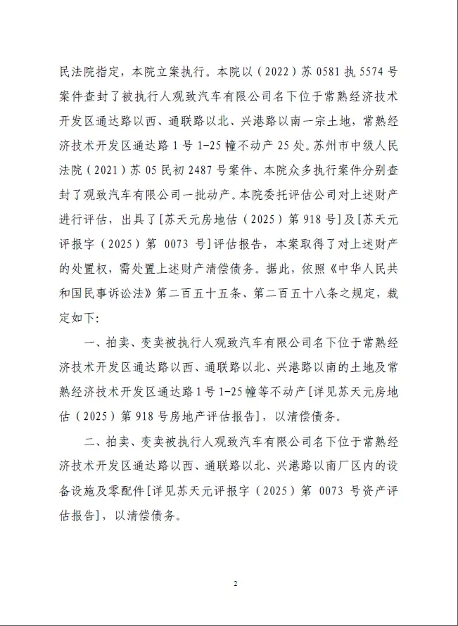 此外,在苏州中级人民法院于2025年12月22日立案受理观致汽车破产重整申请后,相关方公然违反《企业破产法》规定,违法快速推进一拍、二拍程序。二拍起拍价仅为8.6亿元,并计划于2026年1月15日10点正式开拍。