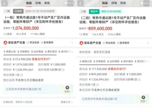 第一财经记者查询到,2025年12月30日,观致汽车常熟工厂进行了第一次拍卖,起拍价约10.75亿元,保证金约为2.15亿元,但遭到流拍。而观致汽车常熟工厂二拍起始价约8.6亿元,相较一拍起始价打了八折,保证金也下降至1.72亿元,加价幅度是100万,将于2026年1月15日10点开拍,竞价周期是1天。
