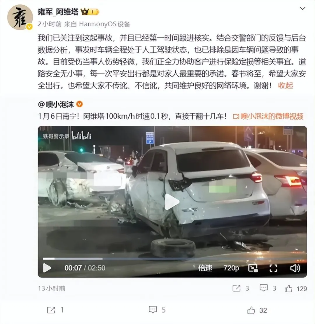 就在网友热议之际,阿维塔科技副总裁雍军很快作出回应。他表示,公司已第一时间关注并跟进核实此事,结合交警部门的反馈与车辆后台数据分析,事发时车辆全程处于人工驾驶状态,已排除车辆本身问题导致事故的可能。