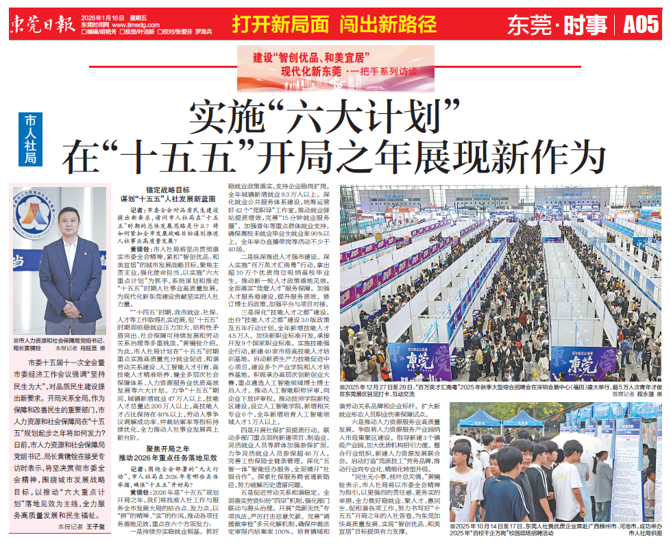 市委十五届十一次全会暨市委经济工作会议强调“坚持民生为大”,对品质民生建设提出新要求。开局关系全局,作为保障和改善民生的重要部门,市人力资源和社会保障局在“十五五”规划起步之年将如何发力?日前,市人力资源和社会保障局党组书记、局长黄镜铨在接受专访时表示,将坚决贯彻市委全会精神,围绕城市发展战略目标,以推动“六大重点计划”落地见效为主线,全力服务高质量发展和民生福祉。