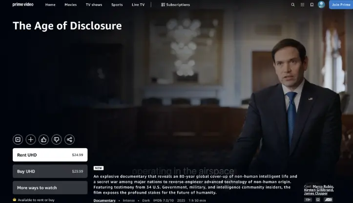 2025 年,有一部美国纪录片在Amazon Prime Video 上映,同时创造了这个平台同类型的观看纪录。这部纪录片名为“揭秘时代”,由丹·法拉执导并制作,汇集了 34 名现任和前任美国政府、军方和情报部门内部人士,包括美国国务卿鲁比奥。