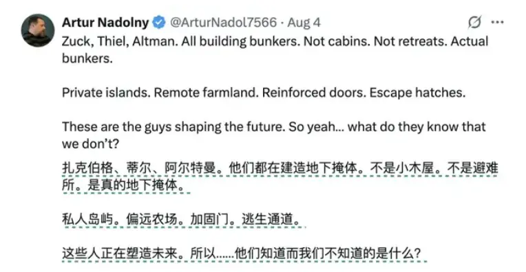 另外,还可以观察像马斯克、扎克伯格或顶级财富管理机构的资产配置。如果他们开始大规模转向地外资源开发或地下堡垒建设,这时普通人就要警觉了。