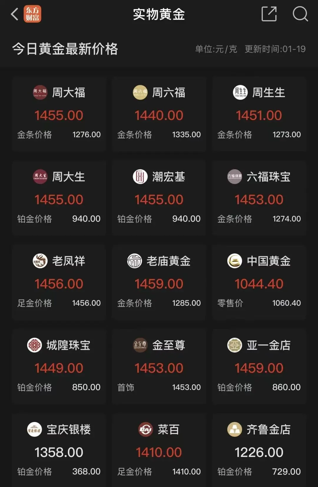 老庙黄金每克1459元,较前一日上涨24元/克;周生生每克1451元,较前一日上涨22元/克;老凤祥报价每克1456元,较前一日上涨20元/克;周大福每克1455元,较前一日上涨19元/克;潮宏基每克1455元,较上一日涨19元/克;六福珠宝与金至尊也都报1453元/克,较上一日涨19元/克。