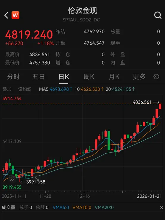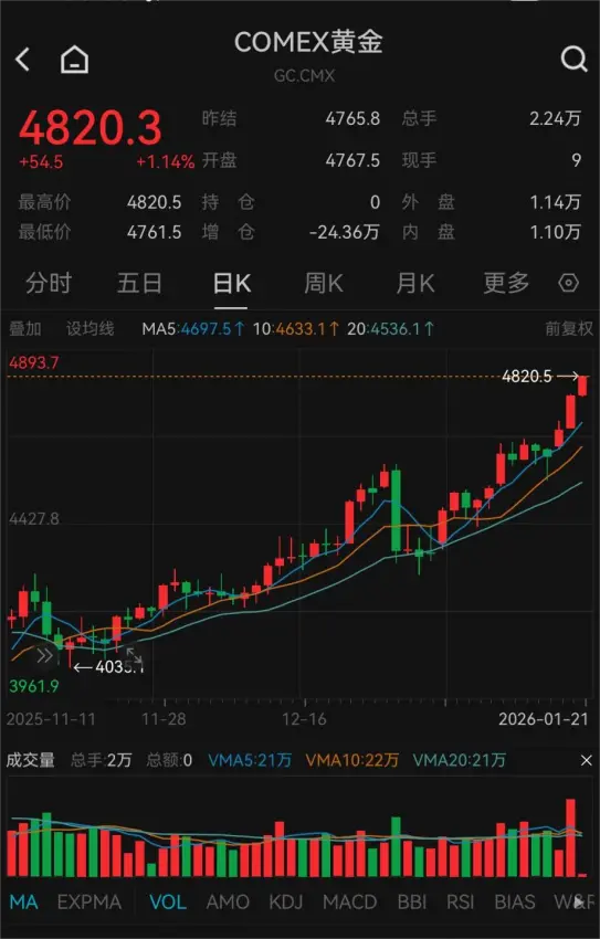 1月21日,现货、期货黄金双双突破4800美元/盎司关口。截至发稿,COMEX黄金报4820.3美元/盎司,上涨1.14%;伦敦金报4819.24美元/盎司,上涨1.18%。