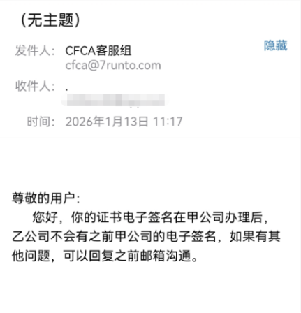 1月13日,大众新闻记者以用户身份致电中金公司,询问同一签名主体在同一机构是否同期只能持有一个签名。在经过了反复确认后,1月16日下午,中金公司客服组相关负责人表示,上述事件中涉及的电子签名,可以同时认证多个电子签名。