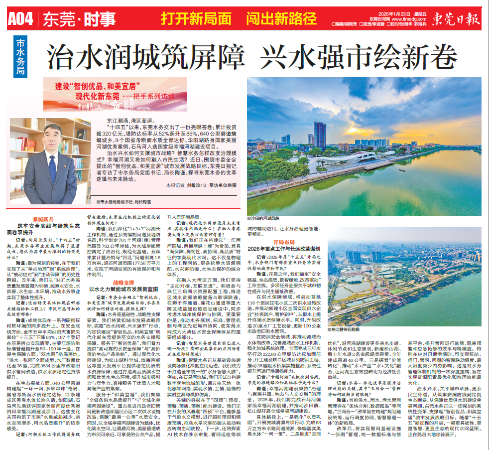 1月5日,市委十五届十一次全会暨市委经济工作会议召开。会议提出,加快建设“智创优品、和美宜居”的现代化新东莞,深入推进“九大行动”,为东莞“十五五”时期开好局、起好步勾勒出清晰路径。为深入贯彻落实市委全会精神,即日起,本报推出“建设‘智创优品、和美宜居’现代化新东莞——一把手系列访谈”,深入市直有关部门及各镇街(园区)开展一线调研采访,聚焦各地各部门结合实际、因地制宜,贯彻落实全会精神的思路举措与实际成效,进一步凝聚发展共识、汇聚实干合力,全面呈现全市开局即决战、起步即冲刺的昂扬态势。敬请垂注!