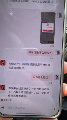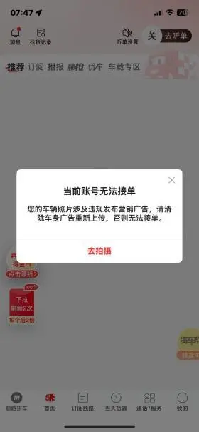 更多司机的维权声音在网络扩散。抖音账号 “不喜欢开车的小宁” 发布视频解读该规则,“飞哥货运 vlog” 展示了平台 “清除车身广告否则无法接单” 的系统提示截图。“依维柯货运炮哥” 在视频中质问:“车身广告是我们能决定的吗?” 部分司机仅收到 “存在违规行为” 的模糊通知,未获具体解释,而另一些司机则被告知需移除车贴方可申诉解封。