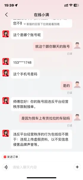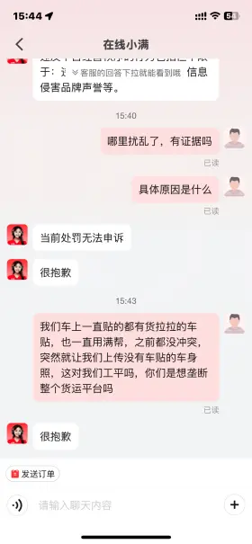 胡师傅尝试与“运满满”平台客服沟通,得到的反馈多与“车贴”相关。客服表示,根据平台最新规则,车身带有其他竞品平台显著标识或广告的车辆,可能被视为不符合平台运营规范。最终导致胡师傅没办法进行多平台接单。