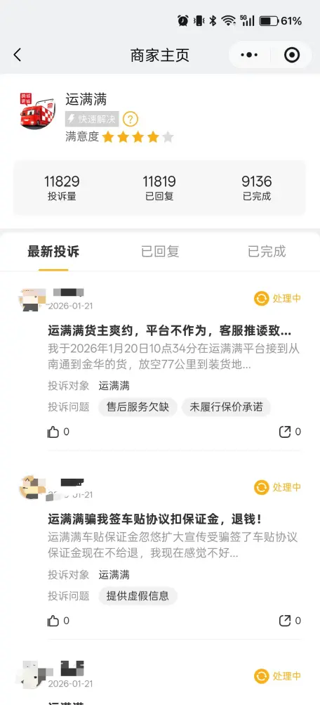 除 “二选一” 争议外,运满满平台的多项服务乱象遭到集中投诉。黑猫投诉平台统计显示,截至目前,相关投诉已涵盖霸王条款、运费拖欠、虚假信息、强制车贴等多个方面,累计投诉量 11829次。