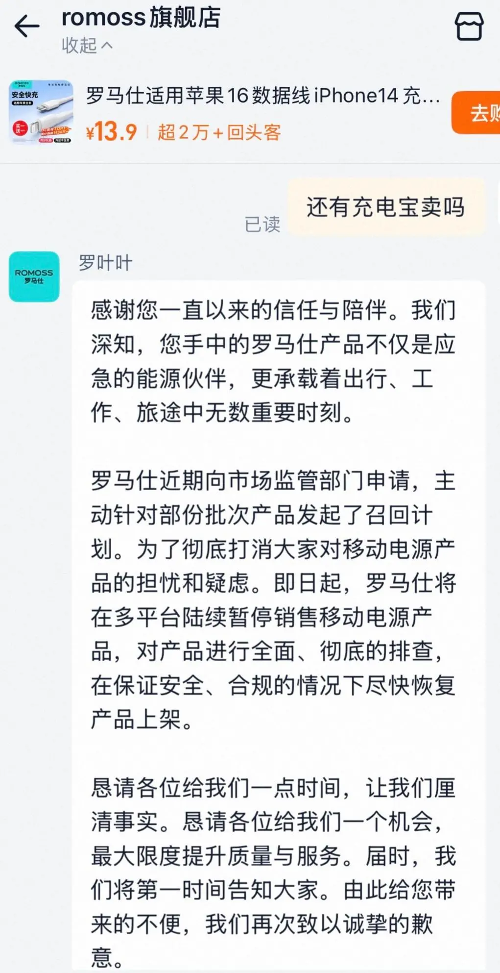 27日下午,记者搜索电商平台发现,罗马仕官方旗舰店已没有充电宝售卖,店里只有数据线、充电器等在售。客服表示,罗马仕近期向市场监管部门申请,主动针对部分批次产品发起了召回计划。即日起,罗马仕将在多平台陆续暂停销售移动电源产品,对产品进行全面、彻底的排查,在保证安全、合规的情况下尽快恢复产品上架。记者询问何时恢复上架,客服表示,目前暂未收到相关通知。
