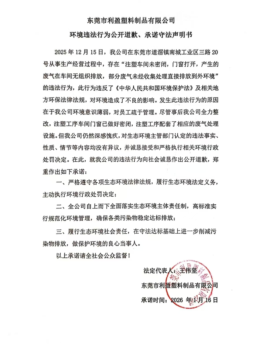 2025年12月15日,我公司在东莞市道滘镇南城工业区三路20号从事生产经营过程中,存在“注塑车间未密闭,门窗打开,产生的废气在车间无组织排放,部分废气未经收集处理直接排放到外环境”的违法行为,此行为违反了《中华人民共和国环境保护法》及相关地方环保法律法规,对环境造成了不良的影响。发生此违法行为的原因在于我公司环境意识薄弱,对员工疏于管理。尽管事后我公司全力整改,注塑工序车间门窗已做好密闭,注塑工序配套了相应的废气处理设施。但我公司仍然深感愧疚,对生态环境主管部门认定的违法事实、性质、情节等内容均没有异议,并诚恳接受和严格执行相关环境行政处罚决定。在此,就我公司的违法行为向社会诚恳作出公开道歉,郑重作出如下承诺:
