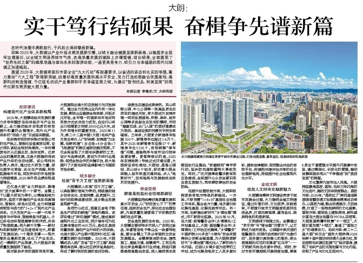 展望2026年,大朗镇将紧扣市委全会“九大行动”等部署要求,以奋进的姿态和扎实的举措,聚力推动“六大工程”取得新突破,统筹好高质量发展和高水平安全,努力打造松朗融合发展高地、高新科技制造强镇、千亿级毛纺织产业集群和平安幸福宜居之城,为建设“智创优品、和美宜居”的现代化新东莞贡献大朗力量。