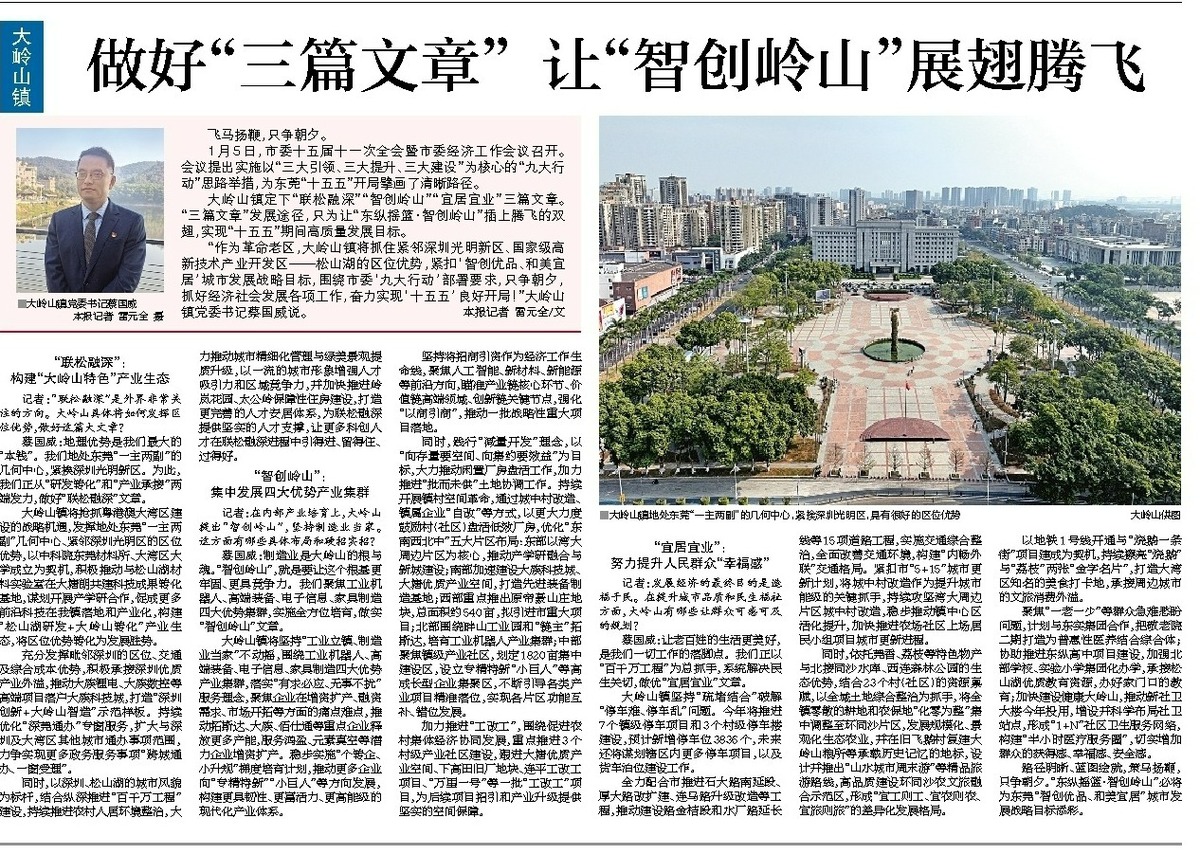 “作为革命老区,大岭山镇将抓住紧邻深圳光明新区、国家级高新技术产业开发区——松山湖的区位优势,紧扣‘智创优品、和美宜居’城市发展战略目标,围绕市委‘九大行动’部署要求,只争朝夕,抓好经济社会发展各项工作,奋力实现‘十五五’良好开局!”大岭山镇党委书记蔡国威说。