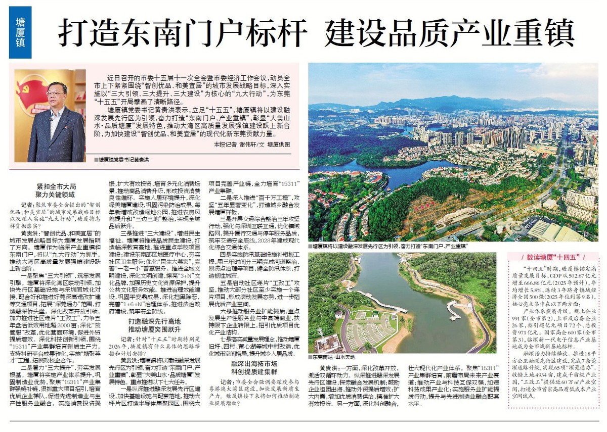 塘厦镇党委书记黄贵洪表示,立足“十五五”,塘厦镇将以建设融深发展先行区为引领,奋力打造“东南门户、产业重镇”,彰显“大美山水·品质塘厦”发展特色,推动大湾区高质量发展强镇建设跃上新台阶,为加快建设“智创优品、和美宜居”的现代化新东莞贡献力量。