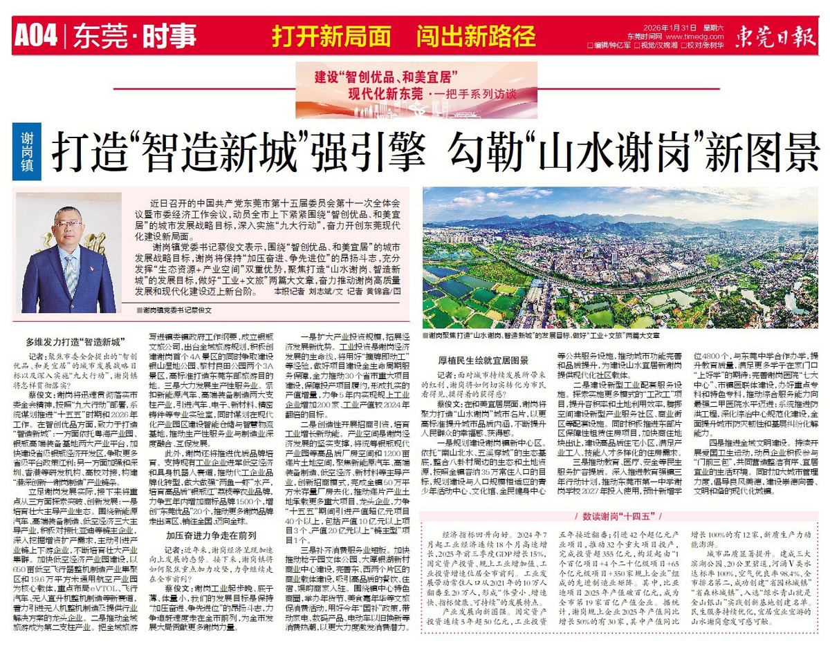 立足谢岗发展实际,接下来将重点从三方面探索突破、创新发展:一是培育壮大主导产业生态。围绕新能源汽车、高端装备制造、低空经济三大主导产业,积极对接比亚迪等链主企业,深入挖掘增资扩产需求,主动引进产业链上下游企业,不断培育壮大产业集群。加快低空经济产业园建设,以650亩低空飞行器整机制造产业集聚区和19.6万平方米通用航空产业园为核心载体,重点布局eVTOL、飞行汽车、无人直升机整机制造等新赛道,着力引进无人机整机制造及提供行业解决方案的龙头企业。二是推动全域旅游成为第二支柱产业。把全域旅游写进镇委镇政府工作纲要,成立银瓶文旅公司,出台全域旅游规划,积极创建谢岗首个4A景区的同时争取建设银山湿地公园、黎村良田公园两个3A景区,高标准打造东莞东部旅游目的地。三是大力发展生产性服务业。紧扣新能源汽车、高端装备制造两大支柱产业,引进汽车、电子、新材料、精密铸件等专业实验室,同时谋划在现代化产业园区建设智能仓储与智慧物流基地,推动生产性服务业与制造业深度融合、互促发展。