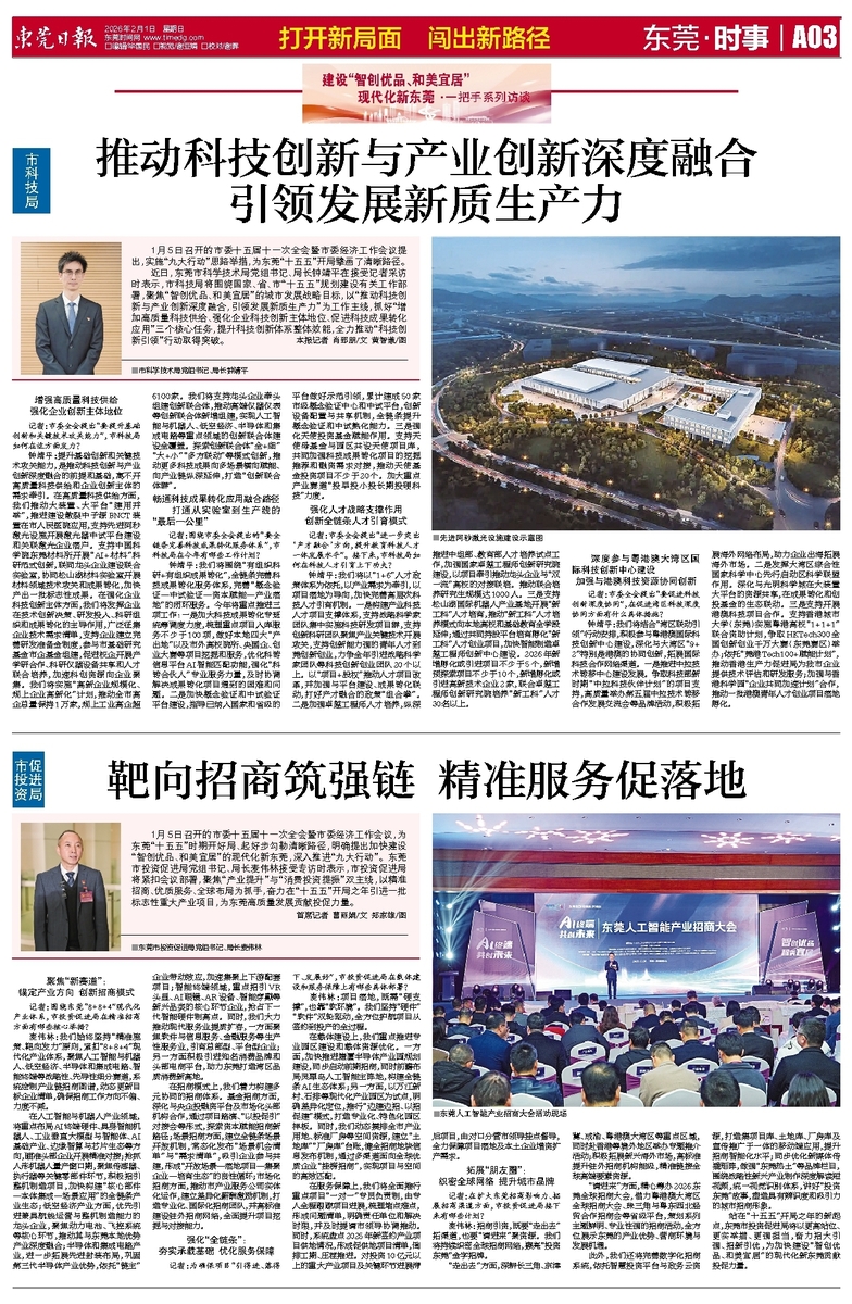 钟靖平:提升基础创新和关键技术攻关能力,是推动科技创新与产业创新深度融合的前提和基础,离不开高质量科技供给和企业创新主体的需求牵引。在高质量科技供给方面,我们推动大装置、大平台“建用并举”,推进建设散裂中子源BNCT装置在市人民医院应用,支持先进阿秒激光设施开展激光器中试平台建设和关联激光企业落户。支持中国科学院东莞材料所开展“AI+材料”科研范式创新,联同龙头企业建设联合实验室,协同松山湖材料实验室开展材料领域技术攻关和成果转化,加快产出一批标志性成果。在强化企业科技创新主体方面,我们将发挥企业在技术创新决策、研发投入、科研组织和成果转化的主导作用,广泛征集企业技术需求清单,支持企业建立完善研发准备金制度,参与市基础研究基金市企基金组建,促进校企开展产学研合作、科研仪器设备共享和人才联合培养,加速科创资源向企业聚集。我们将实施“高新企业规模化、规上企业高新化”计划,推动全市高企总量保持1万家,规上工业高企超6100家。我们将支持龙头企业牵头组建创新联合体,推动高端仪器仪表等创新联合体新增组建,实现人工智能与机器人、低空经济、半导体和集成电路等重点领域的创新联合体建设全覆盖。探索创新联合体“全+细”“大+小”“多方联动”等模式创新,推动更多科技成果向多场景横向赋能、向产业链纵深延伸,打造“创新联合体群”。