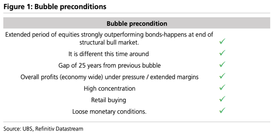 瑞银指出,市场目前仅给泡沫定价约20%的概率,但这一概率可能上升至80%以上(这将意味着股市还有约20%的上涨空间)。自去年12月以来,泡沫形成的全部7个先决条件已经齐备:股票长期大幅跑赢债券、“这次不一样”的叙事、距离上次泡沫25年、整体利润率承压、高度集中、散户买入、宽松的货币条件。