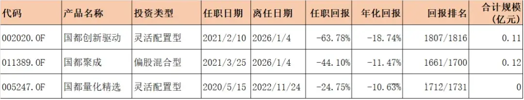 在他管理的10个季度中,国都量化精选仅3个季度实现盈利,任期内亏损幅度达24.75%,最终因业绩持续低迷,在2022年11月清盘。