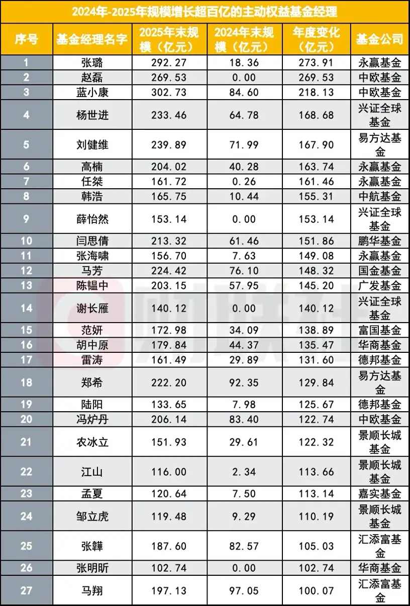 首先,百亿基金经理榜单,大幅扩充。Wind数据显示,按照产品合计管理规模(含共管)统计,截至2025年末,百亿主动权益基金经理数量增至109位,比2024年末的71位明显增多。